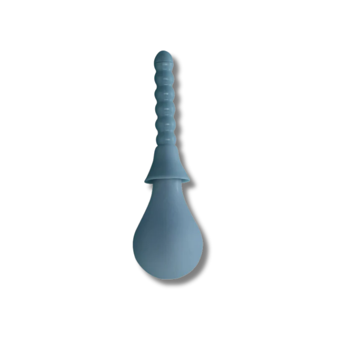 To use, compress the bulb and immerse the nozzle in warm water, slowly releasing the pressure to allow it to fill. Insert the bulb nozzle into the ribbed fitting and then apply a silicone-based lubricant, such as Pure Pleasure, to the fitting to ease insertion. Once inserted, gently squeeze the bulb to spray. After use, separate all parts and pieces, cleaning them thoroughly with warm, soapy water. Place the bulb and ribbed fitting down to dry.